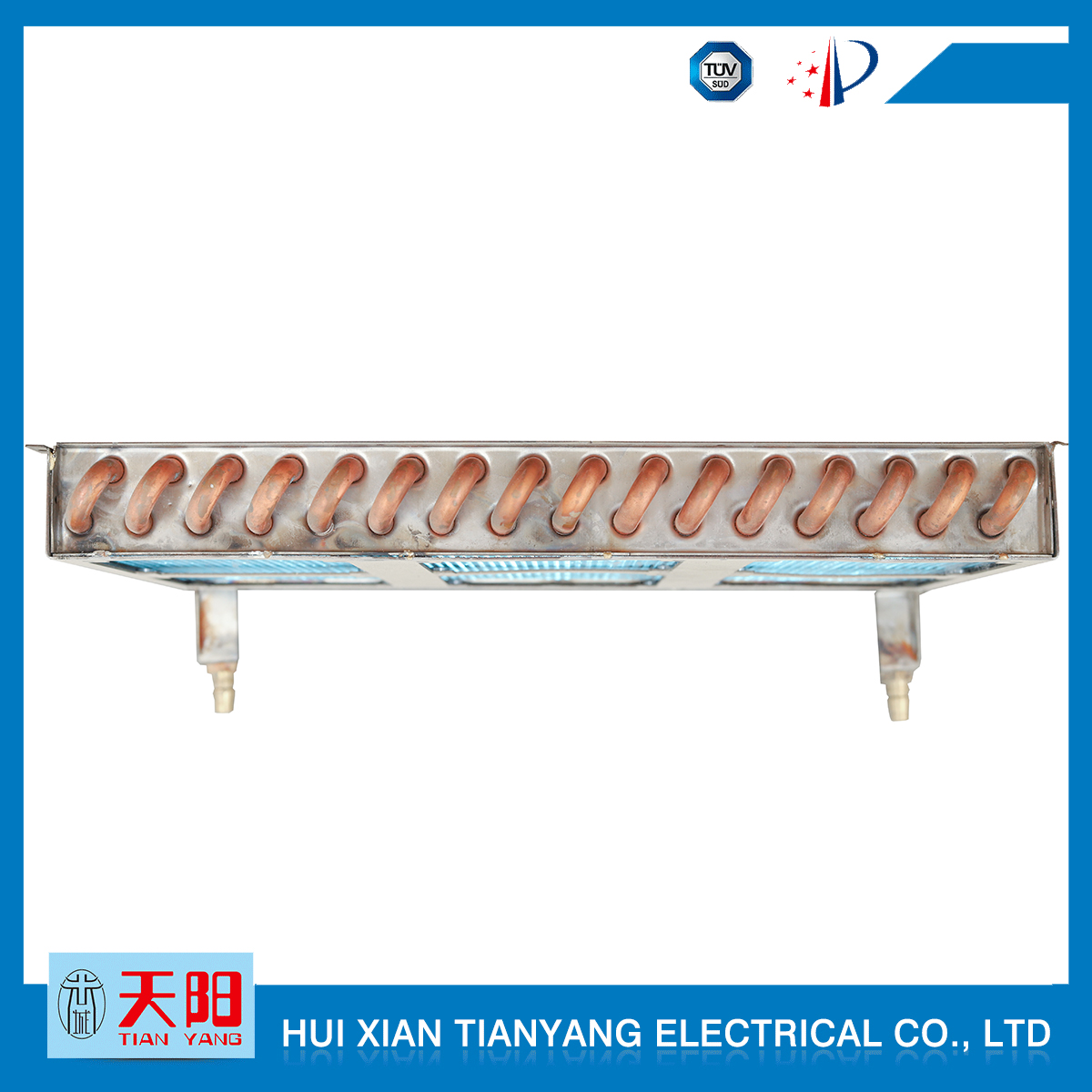 輝縣天陽電器有限責任公司位于肥沃的中原河南省輝縣市學院路中段工業集聚區興業園3號廠房,以制冷設備用冷凝器,蒸發器,熱交換器為主。主要材料為銅管鋁翅片,銅管銅翅片,鋁管鋁翅片。廣泛應用于冰箱冰柜,制冷設備,暖通設備,空調,自動售貨機,冷干機,超市立風柜,冷藏車,烘干機等產品領域。  公司自1998年成立以來,始終堅持:“科技造就產業、質量成就信譽、誠信鑄就輝煌”的質量方針,從產品拓展上堅持“人無我有,人有我優,人優我特的”經營理念,25年來,從1998年開始供應河南冰熊集團下屬的冷柜廠,制冰機廠各種冷凝器;2003年之后,原冰熊集團的精英志士開始在全國各地發展,所到之處依托我公司供貨,以致于多家目前已具行業中佼佼者的公司,從而建立了如凱雪公司,兆邦公司、凌云公司、海寶公司、正雪公司、上海忠云、山東德萊維等幾十余家公司在草創時期的啟蒙供貨商,友好共贏長達十余年,成為我國制冷行業的供應商。以致在2015年初雙匯集團面向社會的招標書中指名要我公司冷凝器、蒸發器指定產品供應商